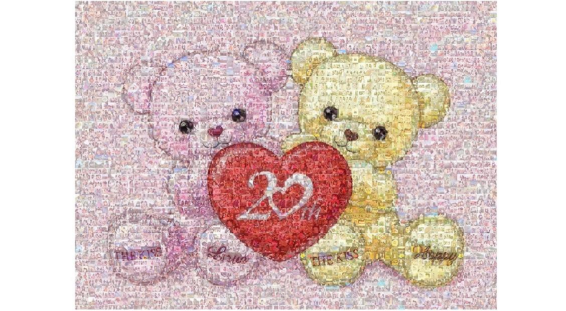 お客様とスタッフで作り上げた特製モザイクアートは、キュートなカップルのベア 「LOVE&HAPPY」です。