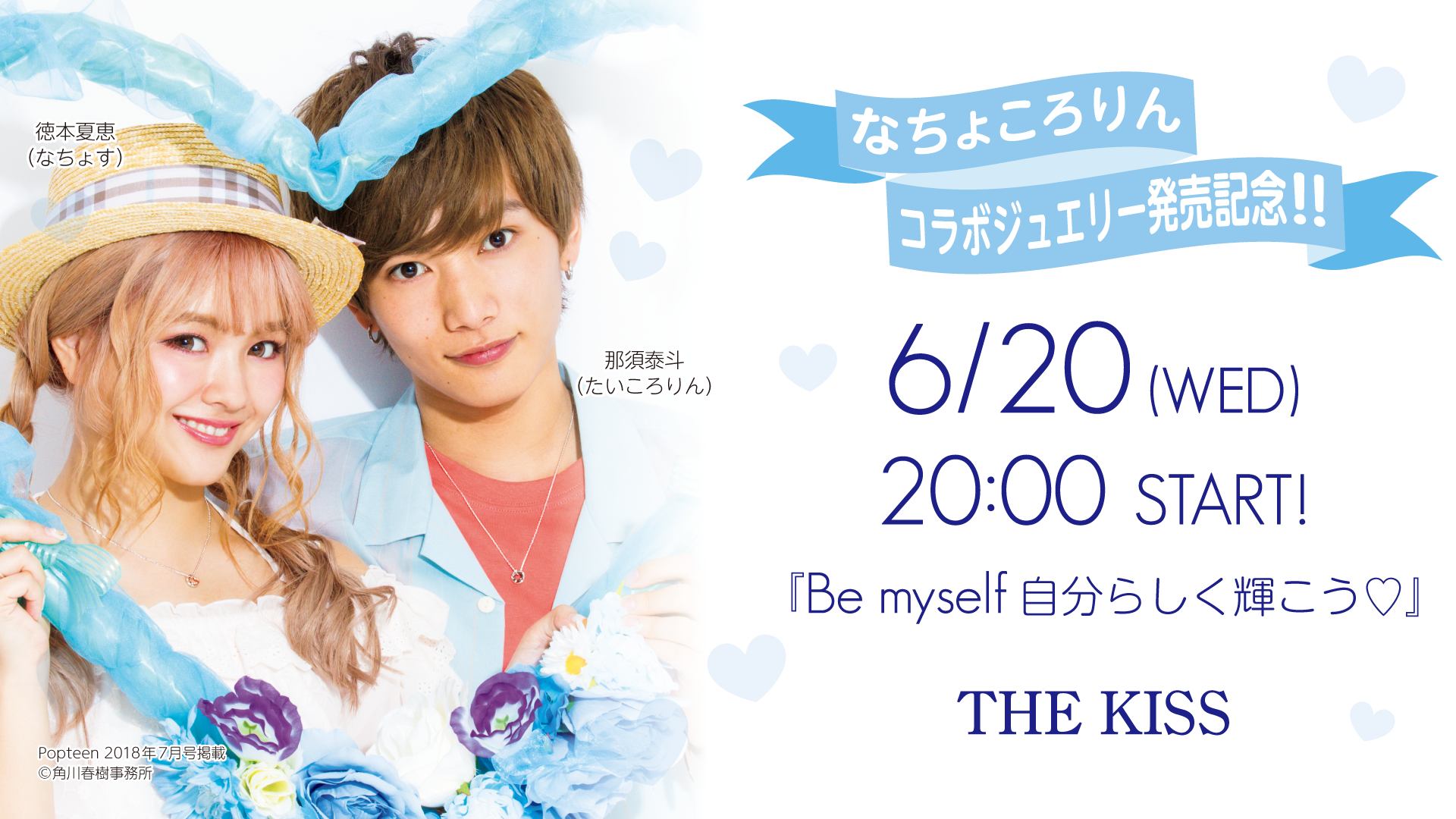 第1回目の配信は、「なちょころりん×THE KISS」コラボジュエリーの発売を記念し、ティーン向けファッション誌「Popteen」の誌面で「なちょころりん」カップルとして⼤人気の、モデル徳本夏恵さん(なちょす)と那須泰⽃さん(たいころりん)が出演いたします。