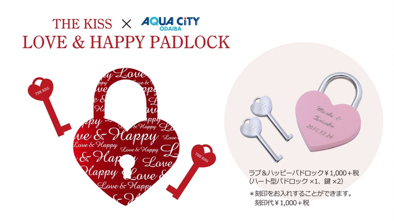 THE KISSではこの伝説にあやかり、ハート型の南京錠に名前やイニシャル、記念日をその場で刻印するサービスを開始します。また、願いを込めて南京錠をかけることができる特設のフェンスをアクアシティお台場3F海側デッキに設置いたしました。