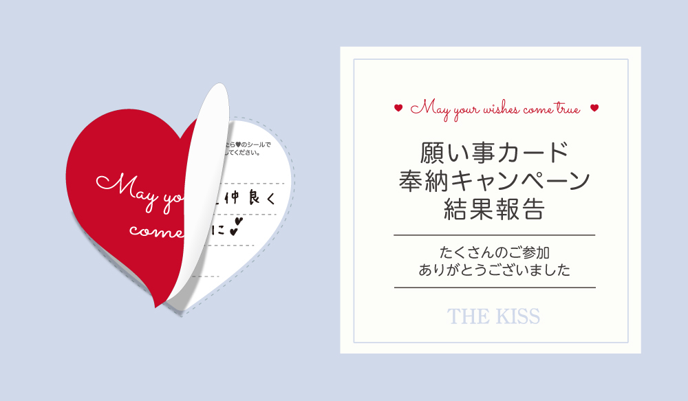 2019年1月14日(火)~2020年3月15日(日)の期間中、THE KISS直営ショップにご来店いただいたすべてのお客様を対象に「願い事カード奉納キャンペーン」を実施いたしました。