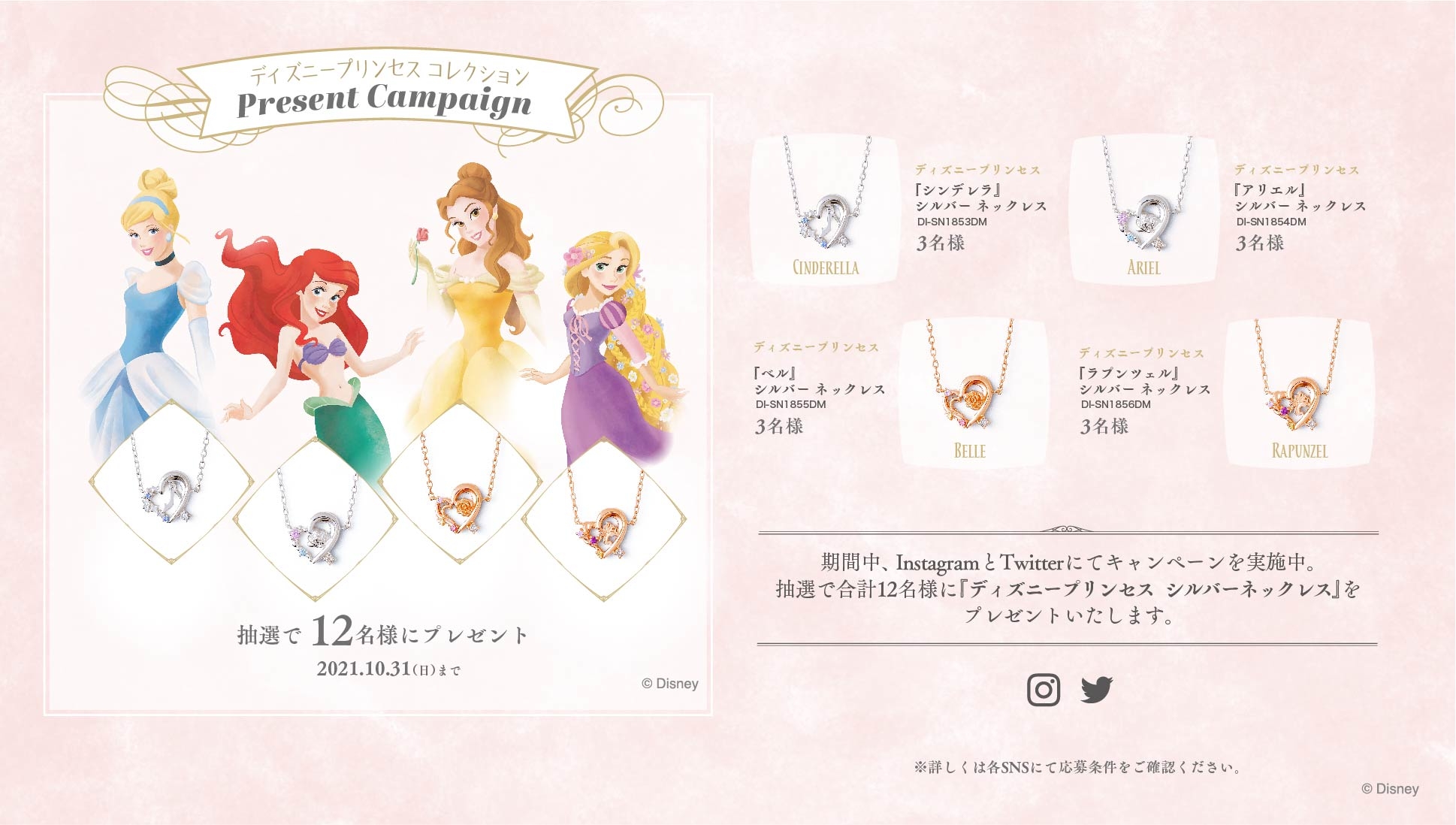 2021年10月5日(火)〜2021年10月31日(日)の期間中、THE KISS公式InstagramとTwitterにて、抽選で合計12名様に<ディズニープリンセス コレクション>シルバーネックレスをプレゼント。