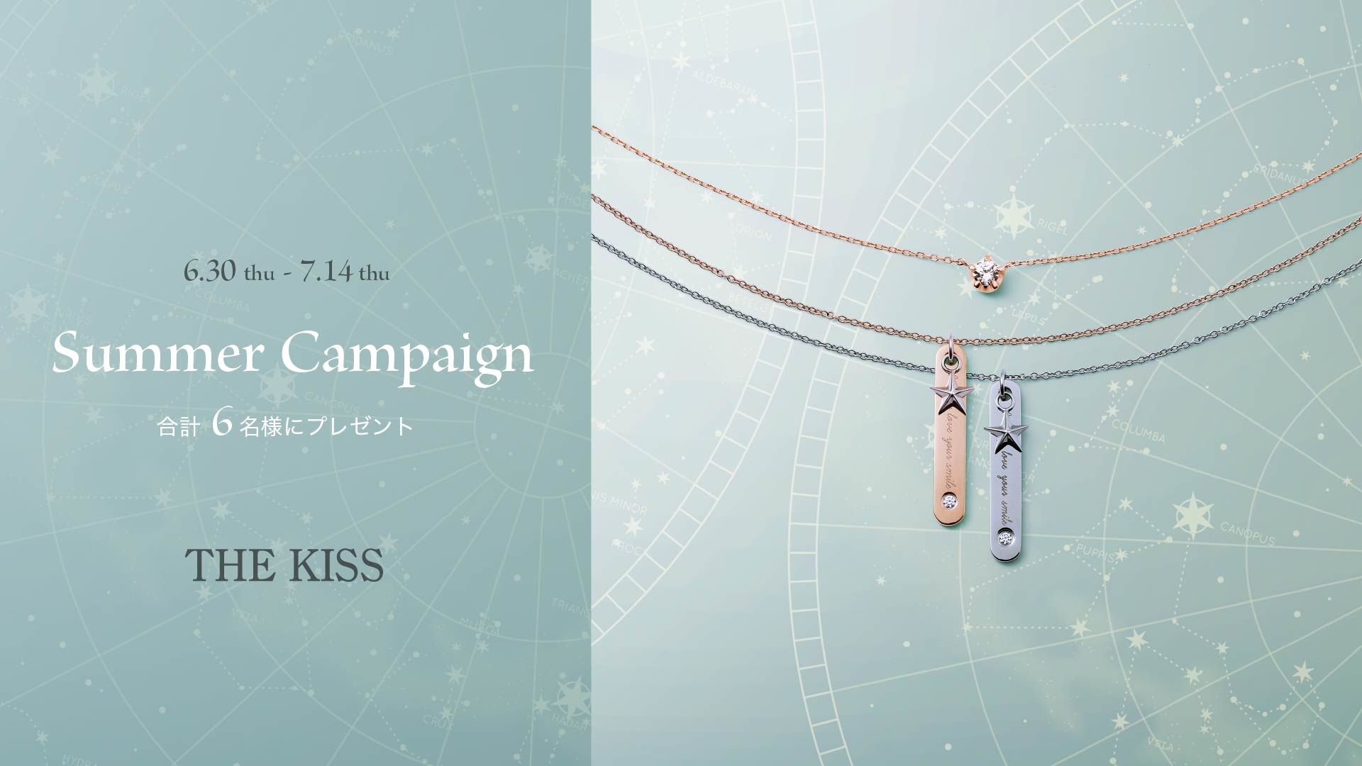 THE KISSから「あなたの願いが叶いますように...」と願いをこめて、抽選で合計6名様にスターモチーフのペアネックレスまたはレディースネックレスをプレゼントいたします。