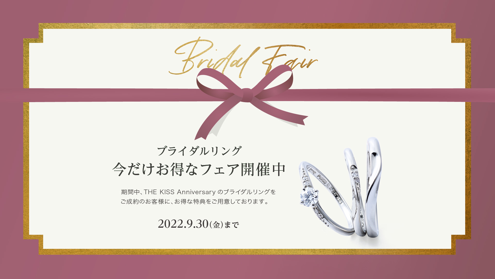 2022年8月15日(月)〜2022年9月30日(金)までの期間中、THE KISS Anniversaryのブライダルリングをご成約のお客様に、お得な特典をご用意しております。