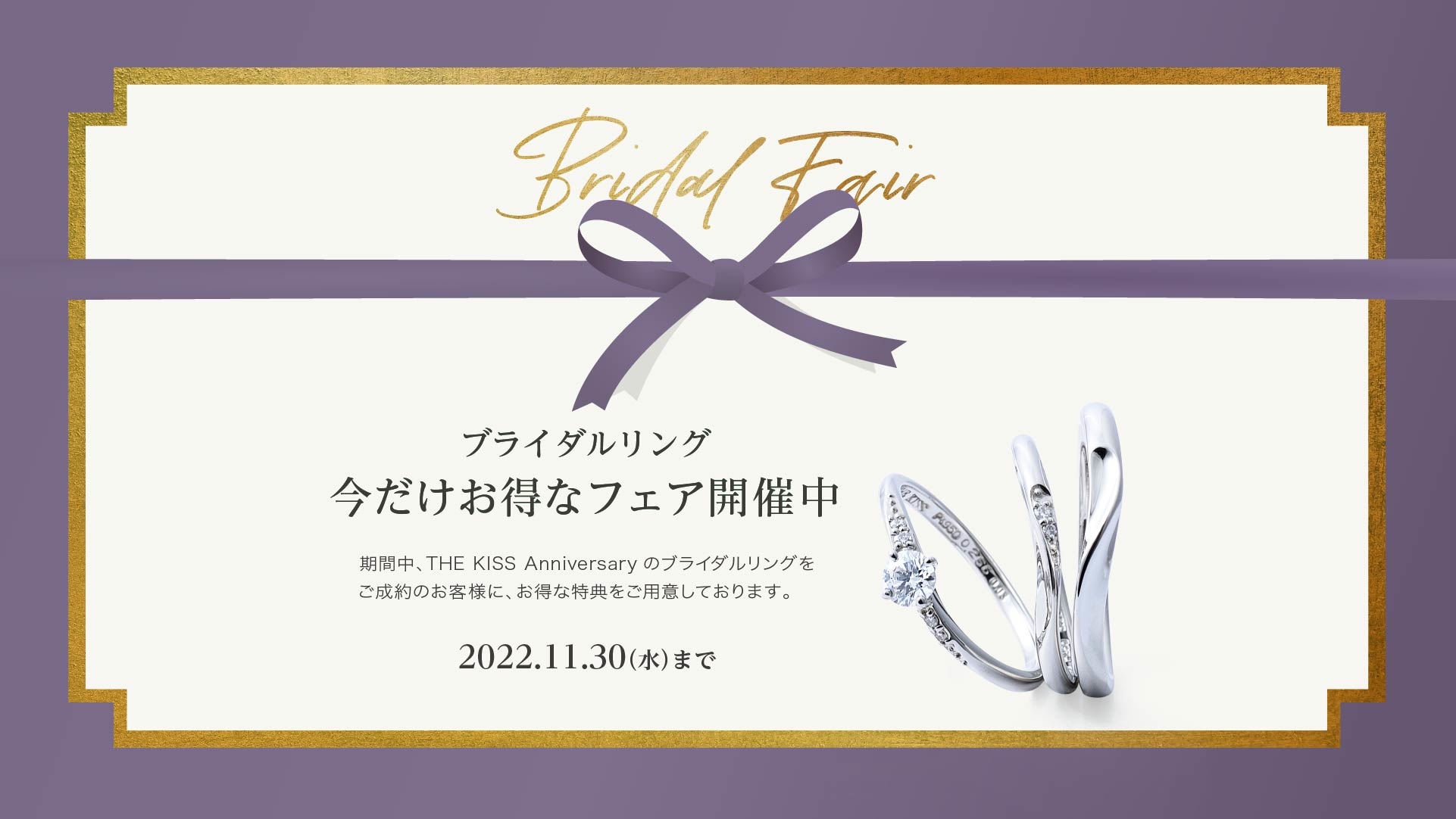 2022年11月1日(火)〜2022年11月30日(水)までの期間中、THE KISS Anniversaryのブライダルリングをご成約のお客さまに、お得な特典をご用意しております。